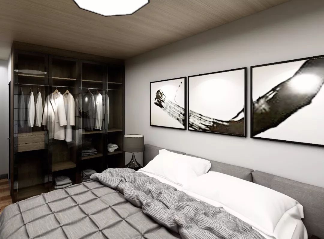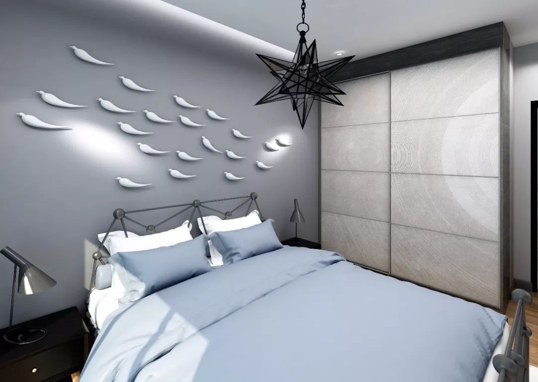 ▲▲▲客卧的设计也十分简单大方,平开门推拉衣柜做满整面墙体,为有限的客卧空间实现更多的收纳功能,金属感十足的床头,墙面上的鸟类装饰,黑色立体星星状灯饰,整体散发着浓浓的现代艺术气息。