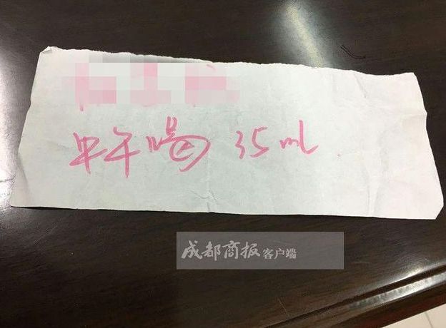 喂药的生活老师蒋阿姨说,“孩子奶奶来送的孩子,拿药给我们时说喂35毫升,当时我就说是不是太多了,她回答说‘孩子妈妈写了的’,并从药瓶中拿出了一张白纸写的纸条,明确写了35毫升。随后,她自己在服药登记表上也写的35毫升。”