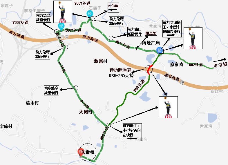 小型汽车利用007乡道、小环线及B02县道绕行丰谷、关帝两地。
