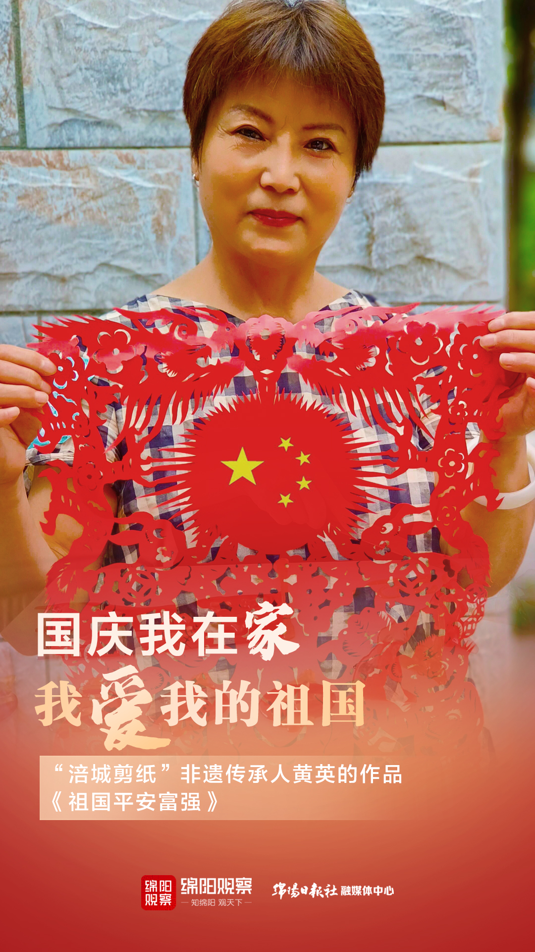 10月1日下午,“涪城剪纸”非遗传承人黄英创作了作品《祖国平安富强》。她说,作为文艺工作者,虽然不能去到一线,但也想借着手中的剪刀和纸,祝福祖国平安富强,赞美抗疫中的那些可爱可敬的人。