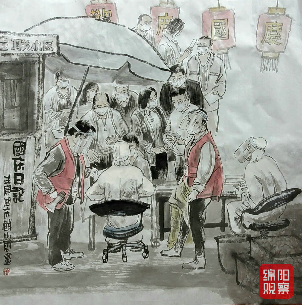 我还看到,绵阳画家鲜小云在看到做核酸的医务人员和志愿者的场景后,创作了市民生活画《国庆日记》;女书法家张平和女儿在家里临摹起《千字文》,书写与国庆有关的文字……绵阳文艺家们用一份匠心与柔情,以他们特有的方式,记录这段特殊的时期。