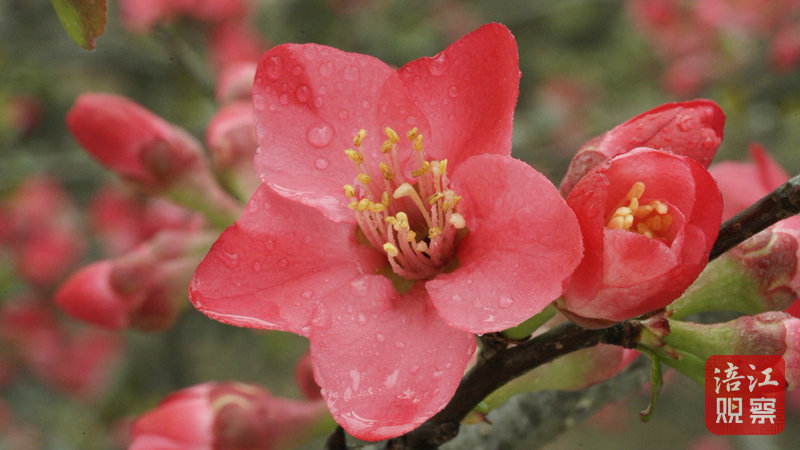 记者在园区看到,一株株贴梗海棠花悄然绽放,红艳似火,真可谓“红花短梗贴枝干,鲜润丰腴夺人目”。海棠花下,不少游客结伴而行,或是驻足赏花,或是拍照合影,沉醉于这动人的花色中,尽情享受浓浓春意。一张张笑脸在时光中定格,一簇簇海棠令人赏心悦目。