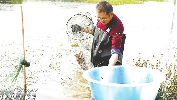 绵阳新闻网讯 4月18日,涪城区吴家镇三清观村元盛稻虾家庭农场稻虾综合养殖稻田里,一片忙碌的丰收景象。农场主李元胜正带领工人下田捞虾,不一会儿,一笼鲜红肥美的小龙虾便被捞了上来(如图)。