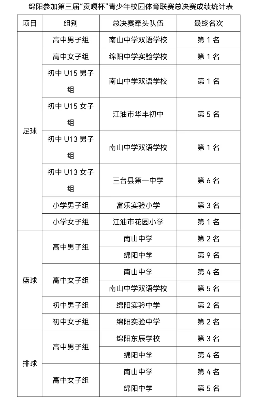 6月2日,记者从市教体局获悉,在刚刚结束的全省第三届“贡嘎杯”青少年校园体育联赛(中小学组)上,绵阳在全部14个组别赛事中,共斩获5个冠军、3个亚军、2个季军,冠军数居全省第一。