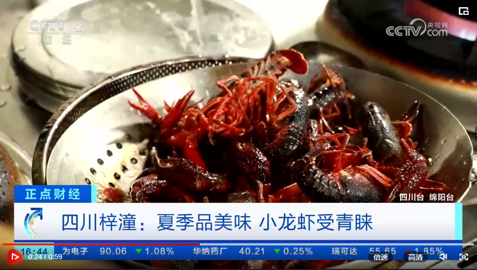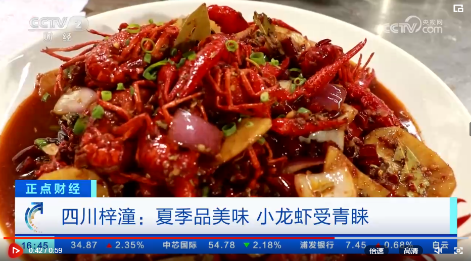 6月15日,央视财经频道《正点财经》栏目播出绵阳梓潼夏季美食——美味小龙虾。