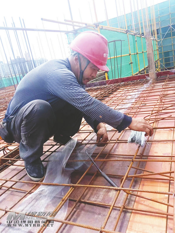 在办公楼楼顶,来自遂宁市船山区的建筑工人谭小兵蹲在屋面上,做楼顶浇筑的最后一道工序——绑扎后浇带。他在工作中不仅要承受烈日的暴晒,还要承受脚下钢筋的高温,更要一丝不苟地完成绑扎工序。