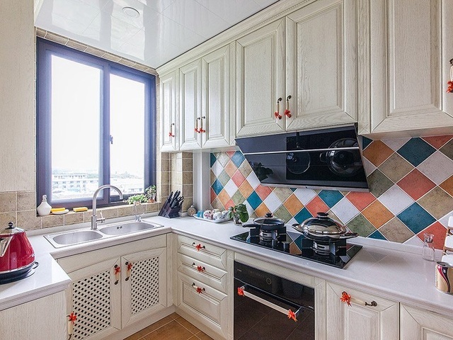 马赛克瓷砖的温暖色彩组成了生机四射美好旋律,宛如进入了花团簇拥的田园花丛,U型厨房让一切的功用都触手可及。