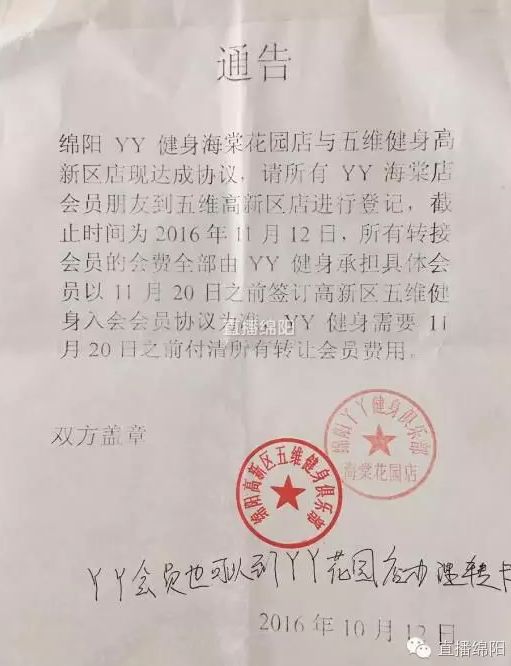 在会员们的要求下,杨世荣通知工作人员送来一张盖有五维健身俱乐部公章的通告。随后,直播绵阳记者通过电话向五维健身俱乐部进行了求证。